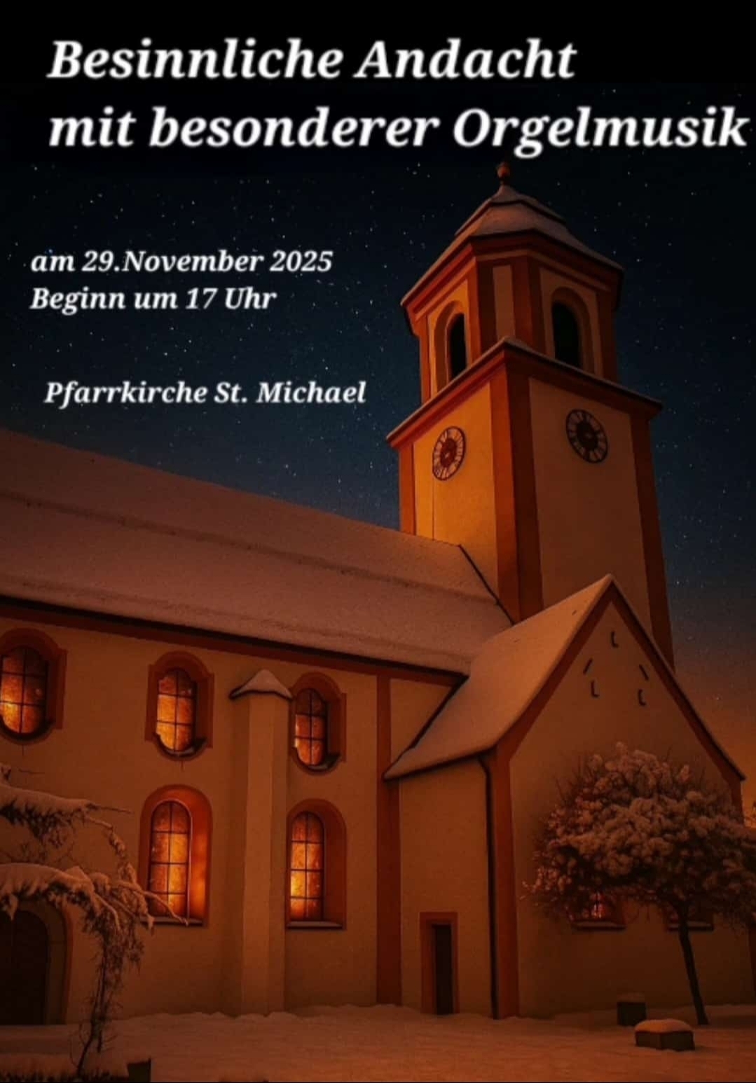Die Ettinger Organisten laden zur besinnlichen Andacht mit besonderer Orgelmusik am Samstag, 29.11. um 17 Uhr in die Pfarrkirche St. Michael ein. Anschließend gibt es Umtrunk und Verköstigung im Pfarrstadl. Einnahmen beider Veranstaltungen sind zugunsten der Renovierung unseres Pfarrstadls. Kommen Sie vorbei, wir freuen uns auf Sie!