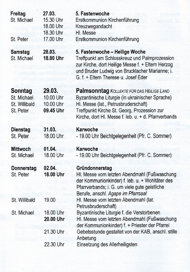 St. Peter | 10.00 Uhr | Heilige Messe für verstorbenen Schredl Adolf und Angehörige; im Gedenken für verstorbenen Kirschner Fritz und Hildegard, Enderle Maria und Albert; im Gedenken für Ploner Anton und Tochter Andrea Nadler |