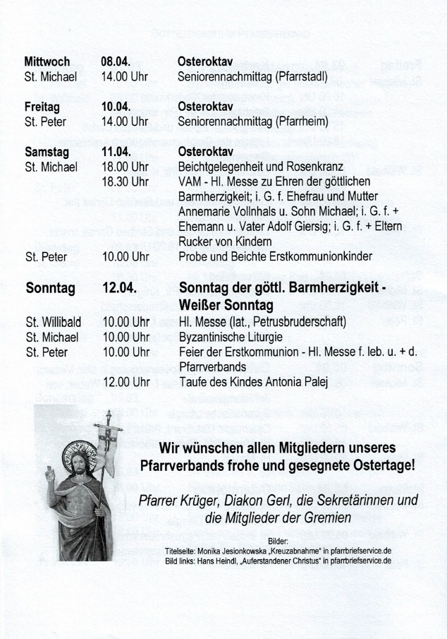 | 18.30 Uhr | Heilige Messe für lebende und verstorbene Mitglieder des Pfarrverbandes |