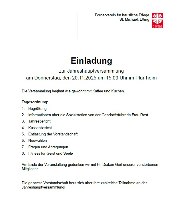 Jahreshauptversammlung des Fördervereins für häusliche Pflege: 20.11.2025 um 15:00 Uhr im Pfarrstadl