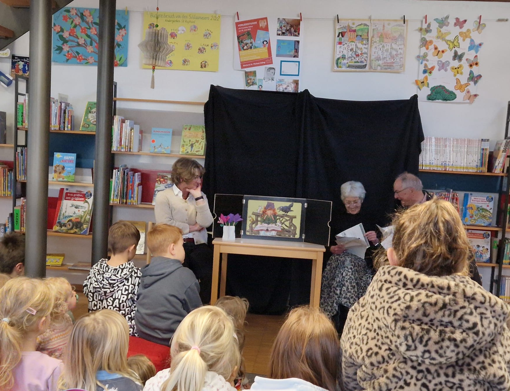 Gekonnt vorgetragen von Erzählerin und Erzähler tauchten ca. 30 Kinder ein in die Welt der Kleinen Hexe, bangten mit ihr um das Gelingen der neuerlernten Zaubersprühe, bedauerten die Misserfolge, waren belustigt über deren Steiche und freuten sich mit dem armen Mädchen über den gelungenen Verkauf von vielen duftenden Papierblumen.