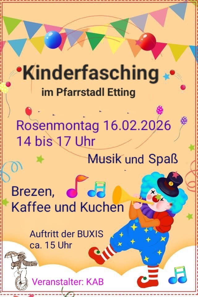 KAB Kinderfasching: 16.02.2026 von 14 bis 17 Uhr im Pfarrstadl